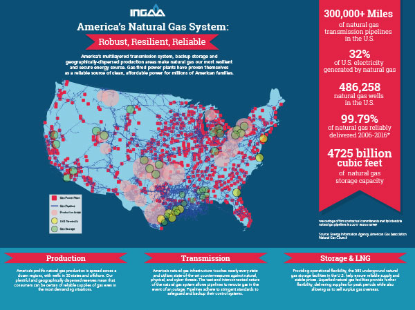 Across the United States, our abundant and available supply of natural gas is helping Americans endure cold winters and other extreme weather events by providing a reliable source of heat and energy. As this infographic demonstrates, the U.S. natural gas infrastructure consists of over 300,000 miles of interstate pipeline and almost a half million producing wells. This system is also can draw upon 3 trillion standard cubic feet of natural gas in underground natural gas storage – enough to supply the natural gas needs of roughly one-third of U.S. households for a year. This diverse and widespread infrastructure helps ensure resilience to weather events and reliable delivery of natural gas to the communities that we serve.